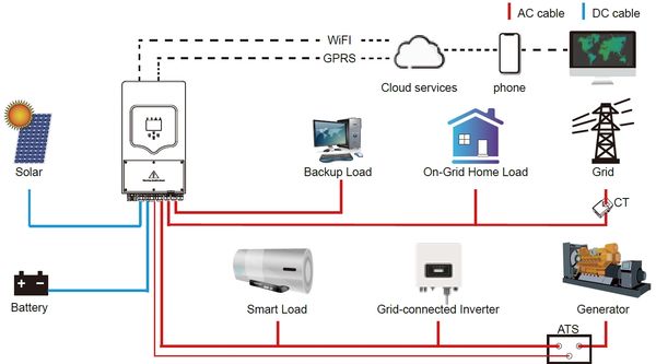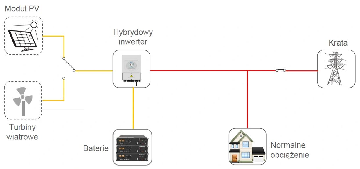 Falowniki hybrydowe Deye są kompatybilne z turbinami wiatrowymi. Obsługuje pierwszy MPPT łączy moduł PV, a pozostałe MPPT łączą turbiny wiatrowe.